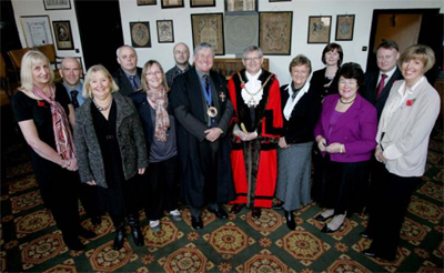 John Heslop, chairman of the Freeman of Durham, and Mayor, Councillor John Wilkinson, with the 11 new members during the event at the Town Hall, in Durham.