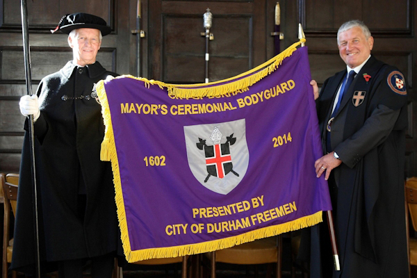 There has been a link between the Freemen and the Durham Mayoral Bodyguard for a number of centuries. As long ago as the 13th Century the Bodyguard gave protection to Wardens as they collected taxes and tithes around the City. When the first Mayor of the City was created in 1602, the Bodyguard became associated exclusively with that office. It is interesting to note that at that time only Freemen had any say in the election of the Mayor, a situation which continued until the Municipal Corporation Act of 1835. The Mayor of Durham City has the oldest Bodyguard outside the City of London.Residents and visitors to the City never fail to be impressed by the pomp that the Bodyguard provide to civic events. We were therefore delighted to be able to offer support to the Bodyguard in refurbishing and enhancing their regalia. Principal in this was the procurement and presentation of a processional banner which will be carried whenever the Bodyguard are involved in ceremonial events throughout the City. The Banner was presented to the Worshipful Mayor and the Bodyguard at a ceremony on 2 November. This was followed by a dedication by the Deputy Dean of Durham.