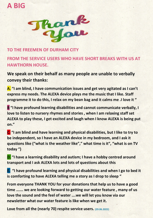 Over two years ago Hawthorn House, a 15-year-old county council-run complex at Newton Hall, Durham City and staffed by a specialist team, used their first £250 windfall to fund an internal decorative make-over which included clocks, cushions, wall art, safety mirrors and bed throws to brighten the surroundings.
