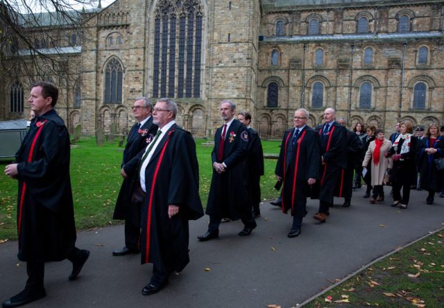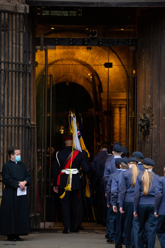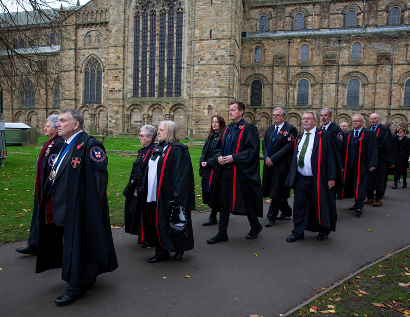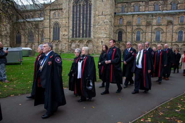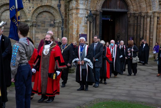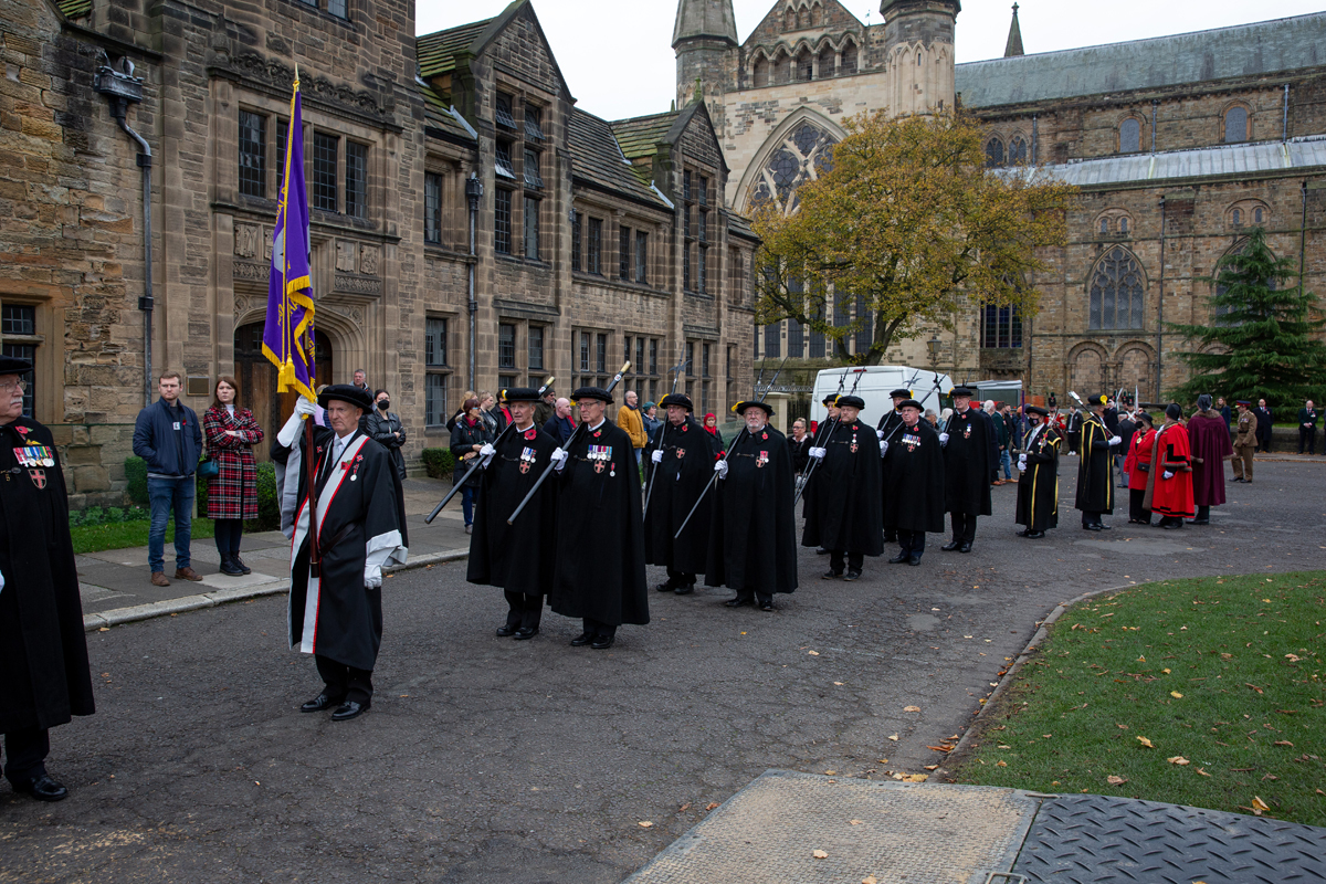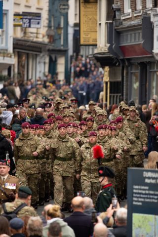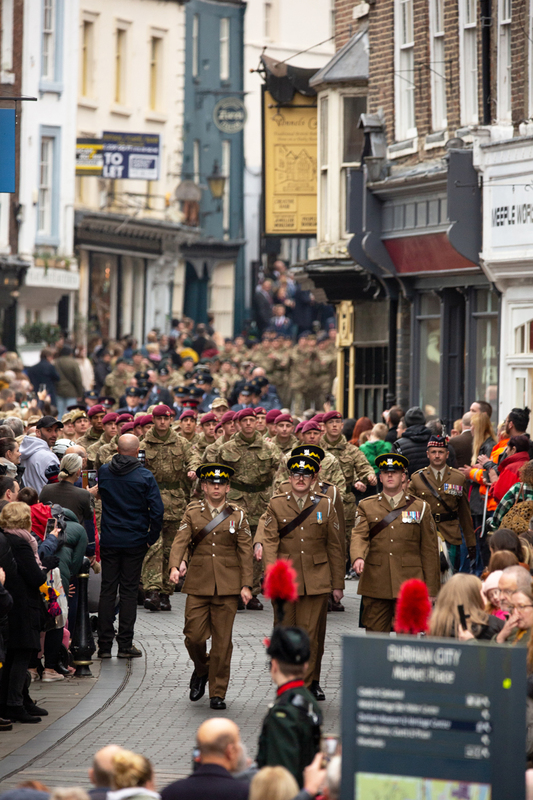Durham City held its Remembrance Day parade in 2021 with traditional events, including a procession from the Cathedral area through the city centre, featuring armed forces, veterans, and cadets, culminating in a service, with commemorations also including virtual elements like recorded poems and online exhibitions for those unable to attend in person, as landmarks were lit up for the occasion.